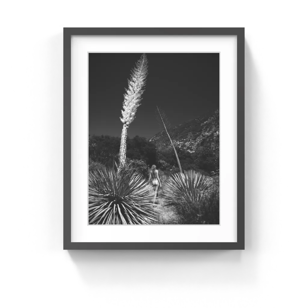 Agave Bloom captures a hauntingly intimate moment in the raw terrain of Joshua Tree, California. A lone figure moves barefoot through towering agaves, framed by desert textures and shadowed silence. Shot in black and white, this fine art photograph channels themes of rebirth, solitude, and feminine resilience—each element glowing beneath the stark desert sun. “Agave Bloom” invites collectors seeking a statement piece that evokes quiet strength and elemental beauty. It’s both deeply sensual and timelessly wild.
