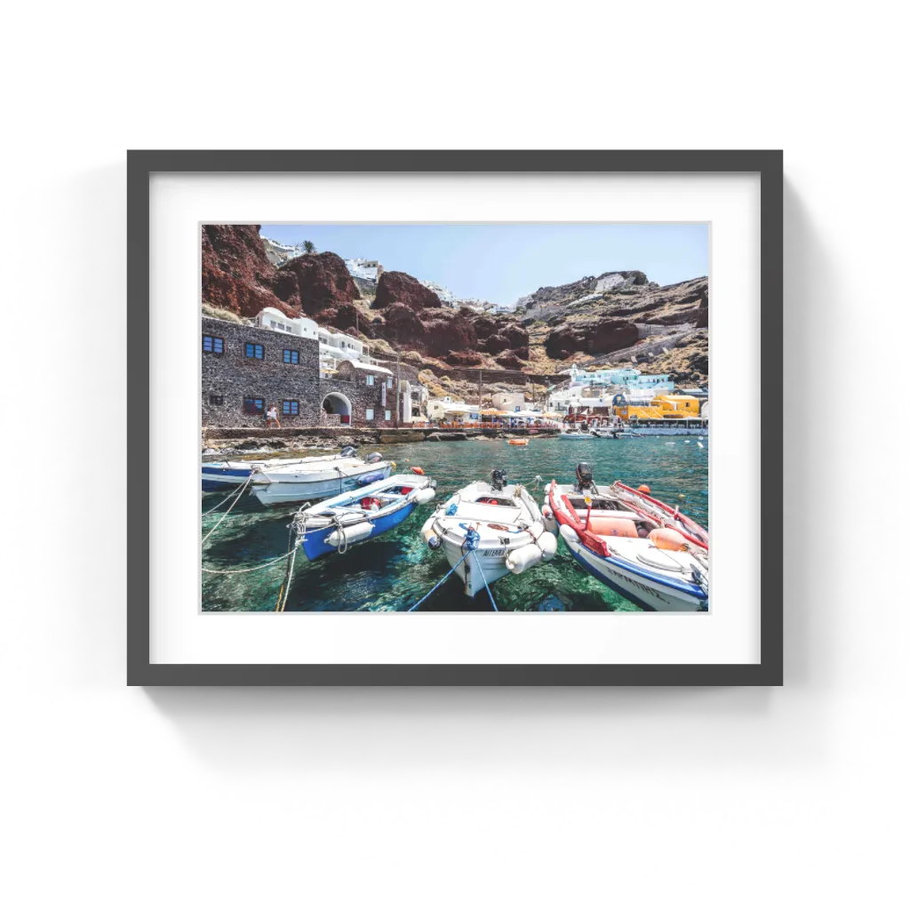 Bay of Amoudi is a captivating luxury framed fine art piece showcasing the idyllic port, Bay of Amoudi, below Oia, Santorini. This artwork captures the essence of coastal bliss, with crystal-clear waters reflecting the vibrant hues of the surrounding architecture and the enticing allure of seafood restaurants. A visual feast for collectors seeking to immerse themselves in the Mediterranean charm, indulge in the dreamlike scenery, and infuse their spaces with the tranquility and sophistication of Santorini's coastal haven.