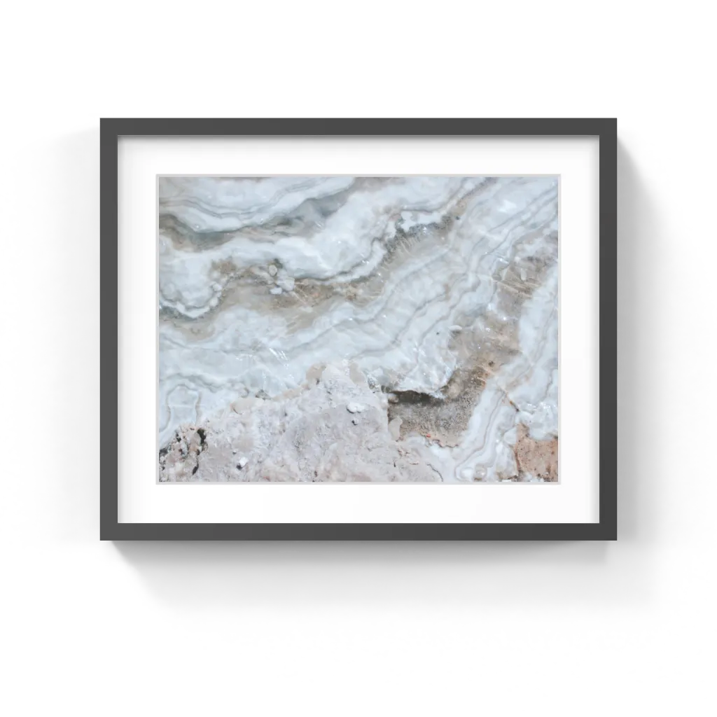 Dead Sea captures the quiet poetry of salt and stone where mineral formations ripple beneath the surface like marble carved by time. The pale blues and soft whites blend into an ethereal palette that feels both ancient and otherworldly, evoking calm and reflection. This piece transforms a moment of stillness into visual serenity. Collecting Dead Sea invites a sense of peace into your home, offering a natural abstraction that grounds any space while reminding us of the beauty found in still waters and timeless textures.